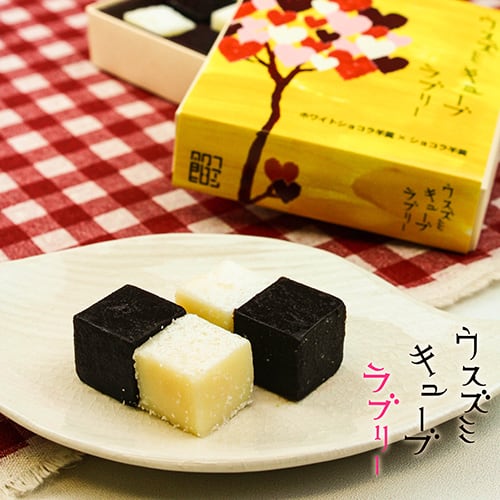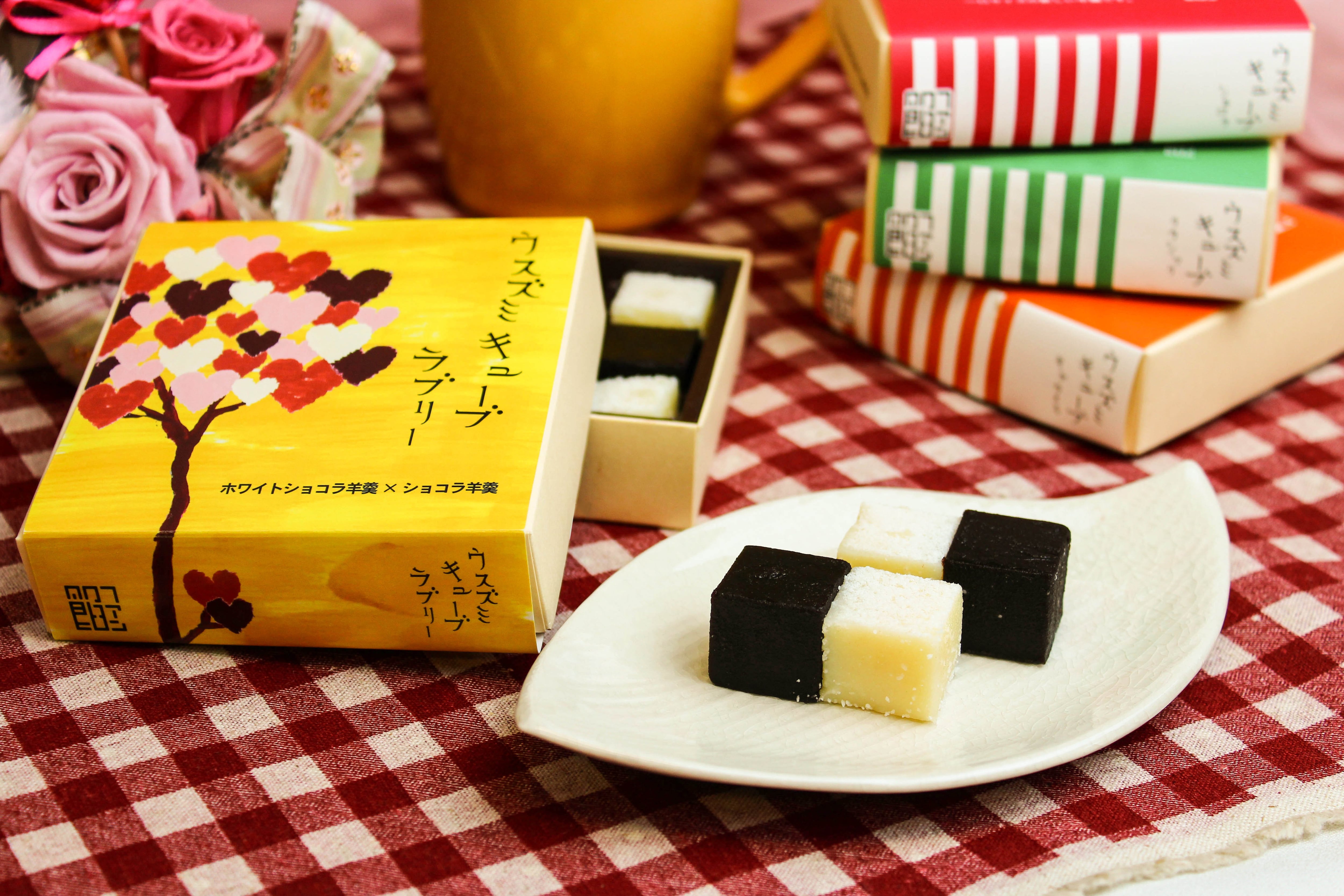 餡ファンの人気商品「ウスズミキューブ」からバレンタインだけの季節限定商品。ショコラとホワイトチョコを贅沢に練り込んだ羊羹です。