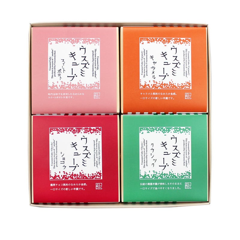 内容量:ウスズミキューブスイートポテト(9個入り)×1箱、ウスズミキューブクラシック(9個入り)×1箱、ウスズミキューブショコラ(9個入り)×1箱、ウスズミキューブキャラメル(9個入り)×1箱